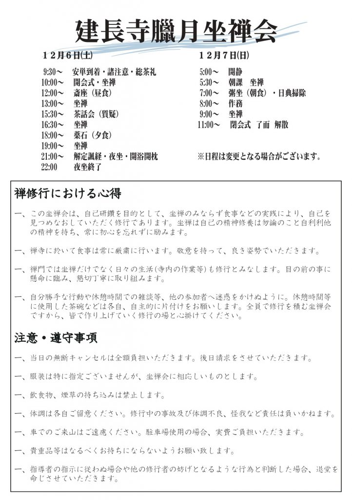- 遅刻すると参加できませんので時間(開始15分前)までに坐禅会場にお入りください。