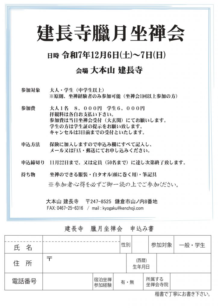 - 会場に「坐禅の手引き」(100円志納)がありますのでお持ちください。